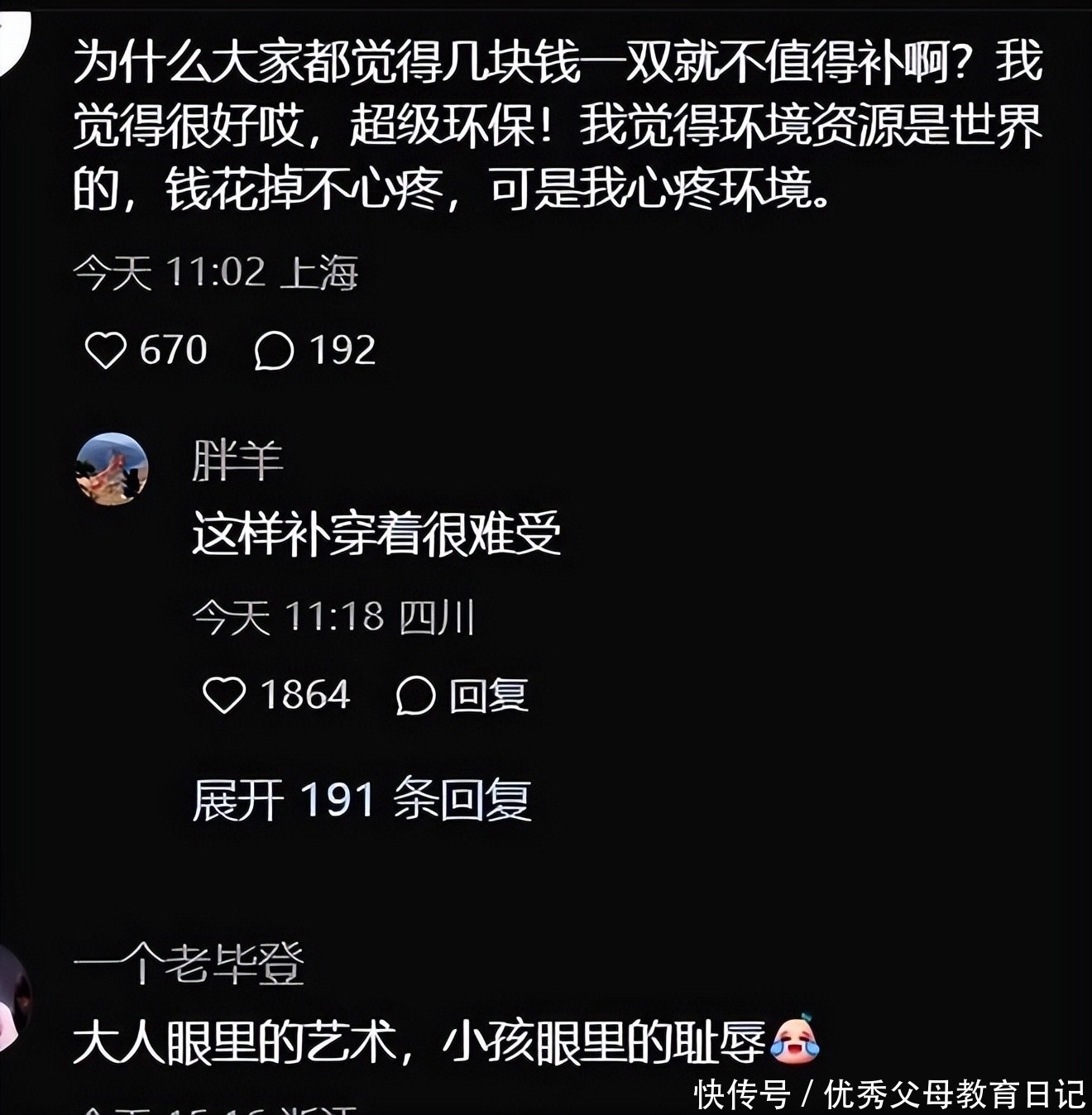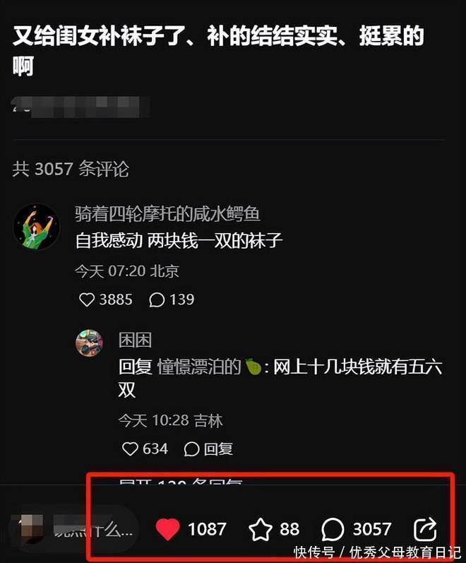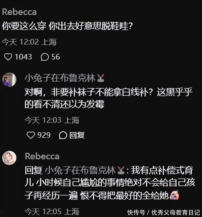 被其他同学围观,显然也会很不好意思吧。另一位上海的家长也提出了另一个疑惑点,母亲补袜子这一点虽然也是爱的表现,但是有必要要用深色的袜子补吗。